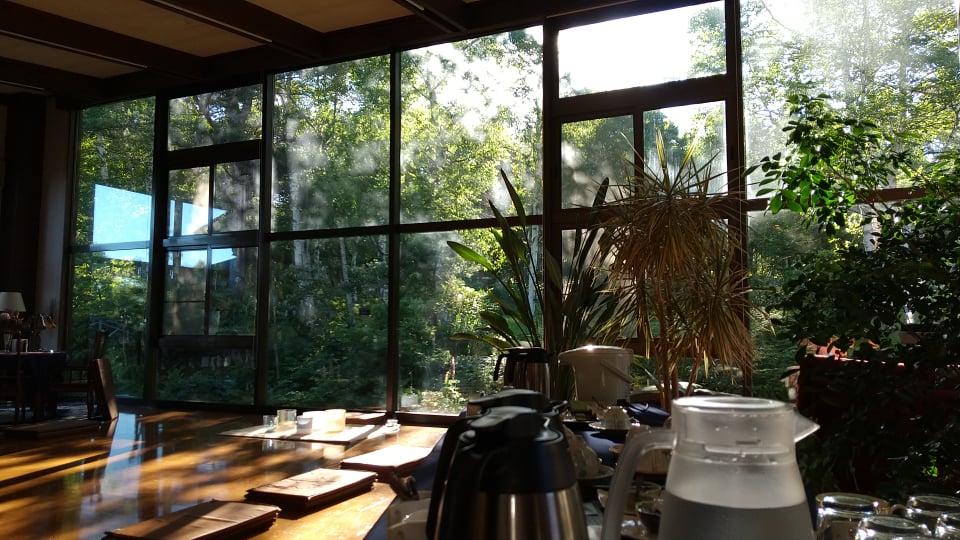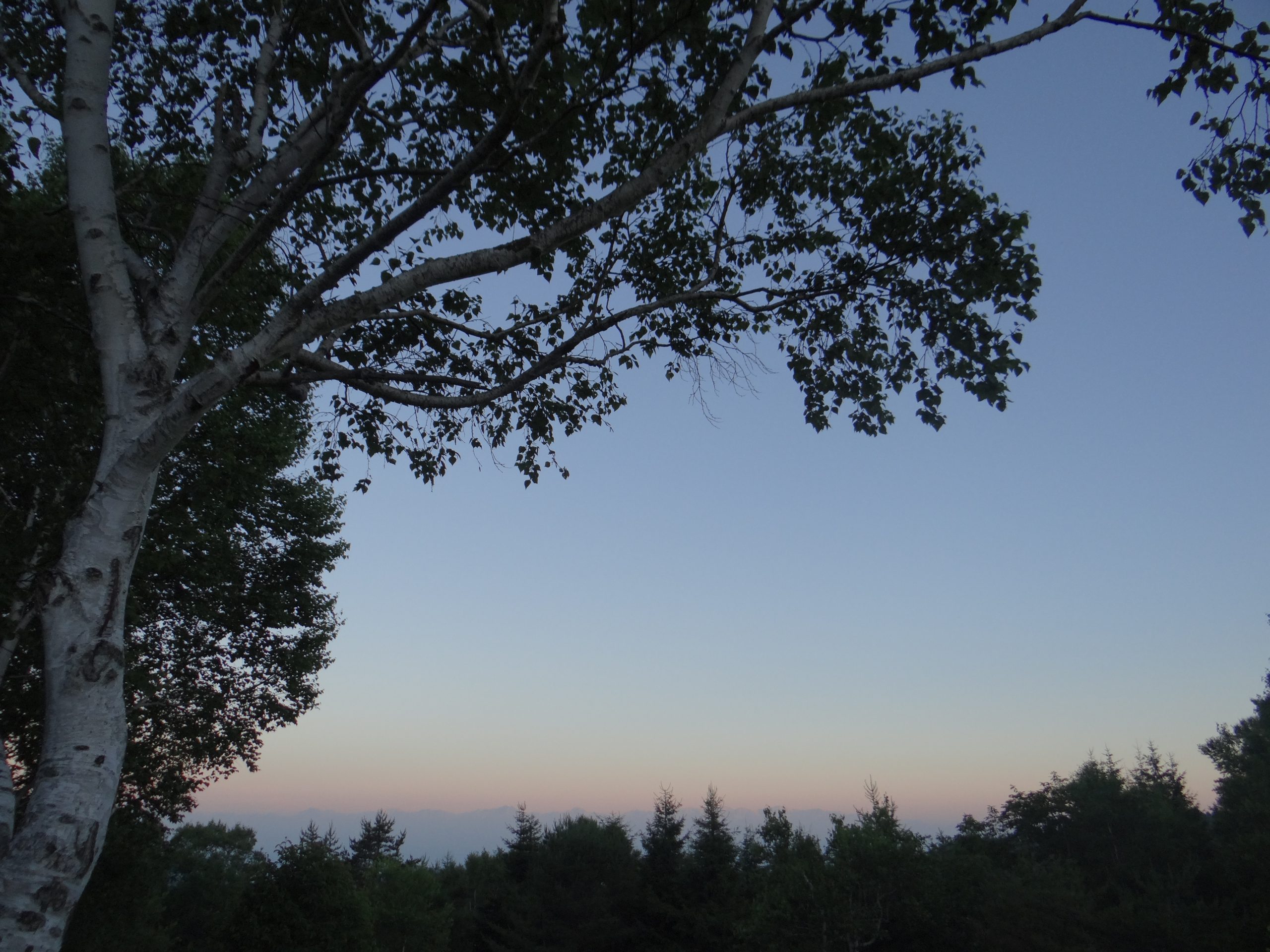 2日目の朝。4時30分ごろに正面玄関をこっそり出て、うっすらとピンク色の北アルプスを眺めることが出来ました。