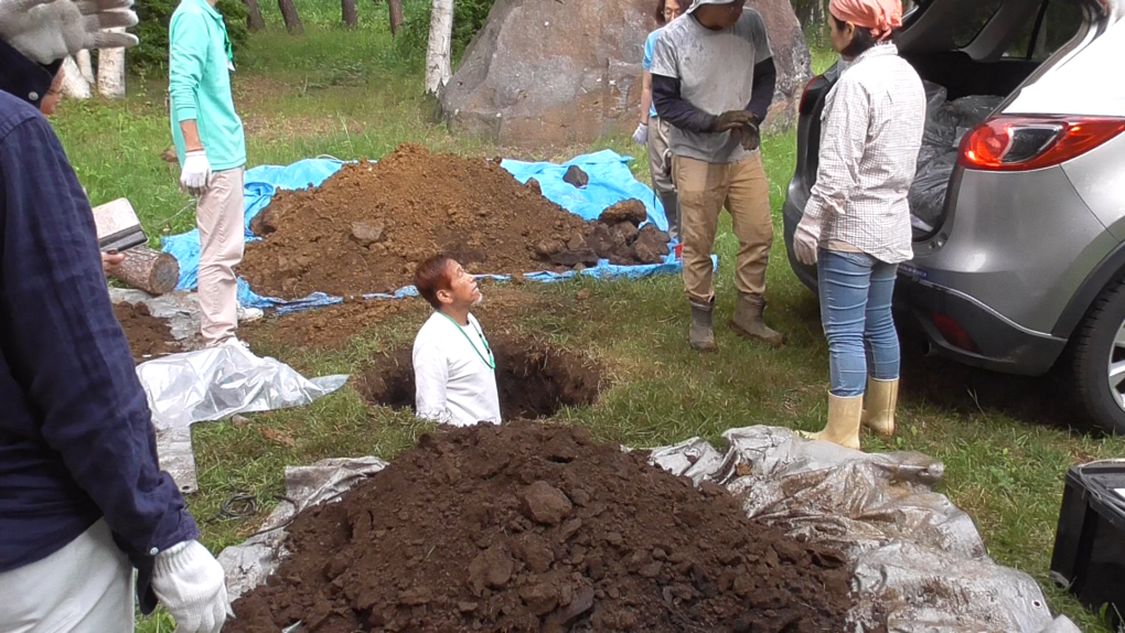 2時間ほどかけ、およそ1メートルほど掘ったところで炭を埋め、土を戻します。