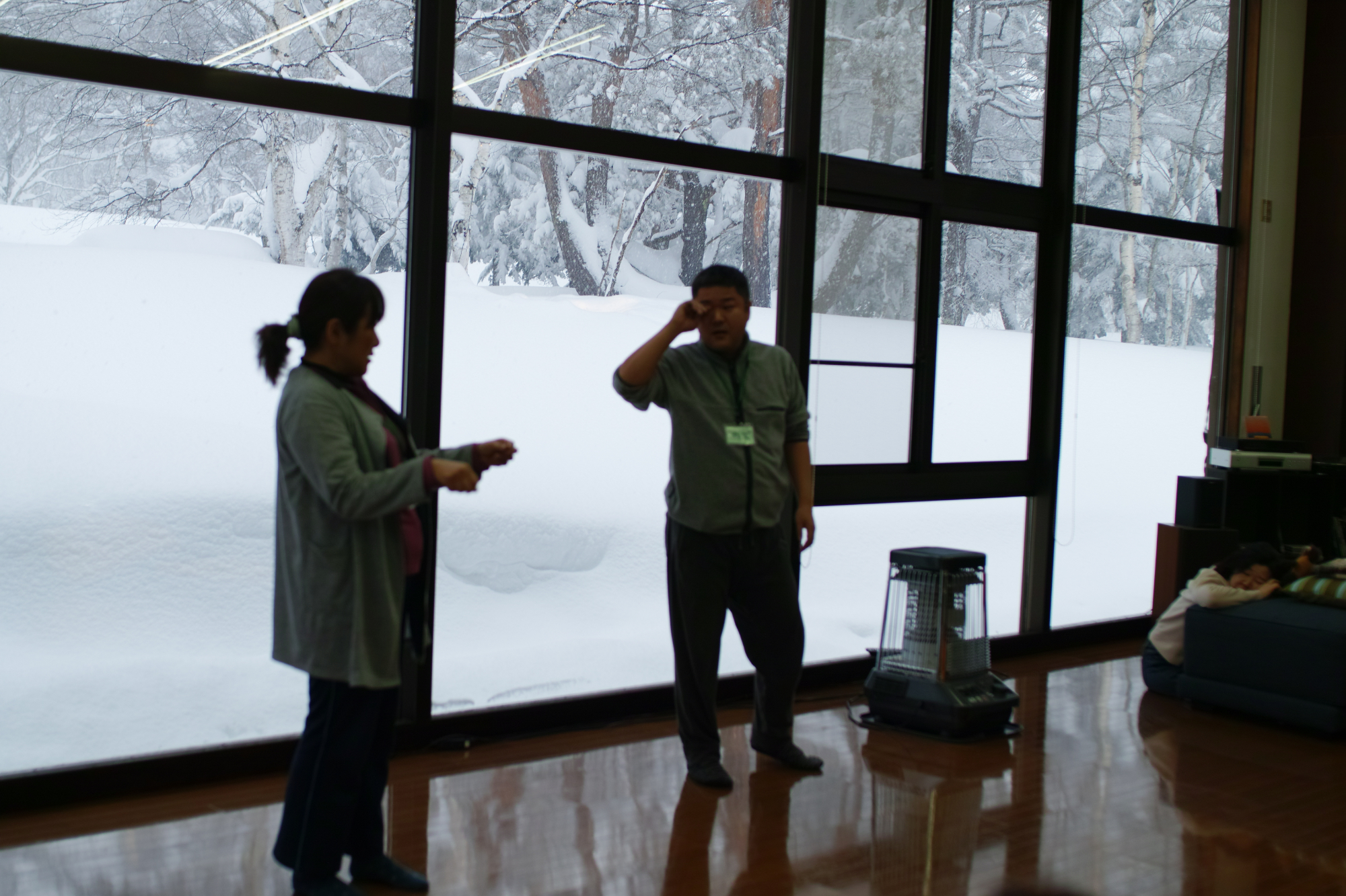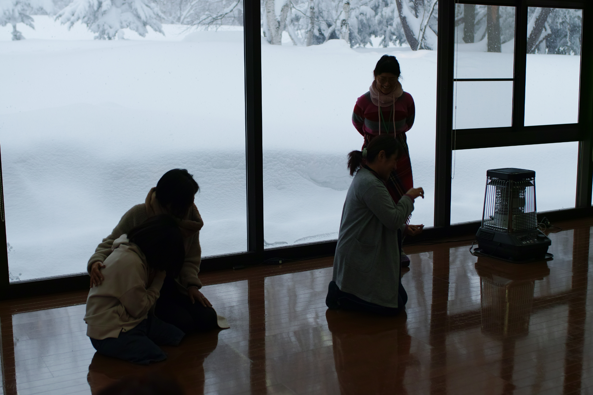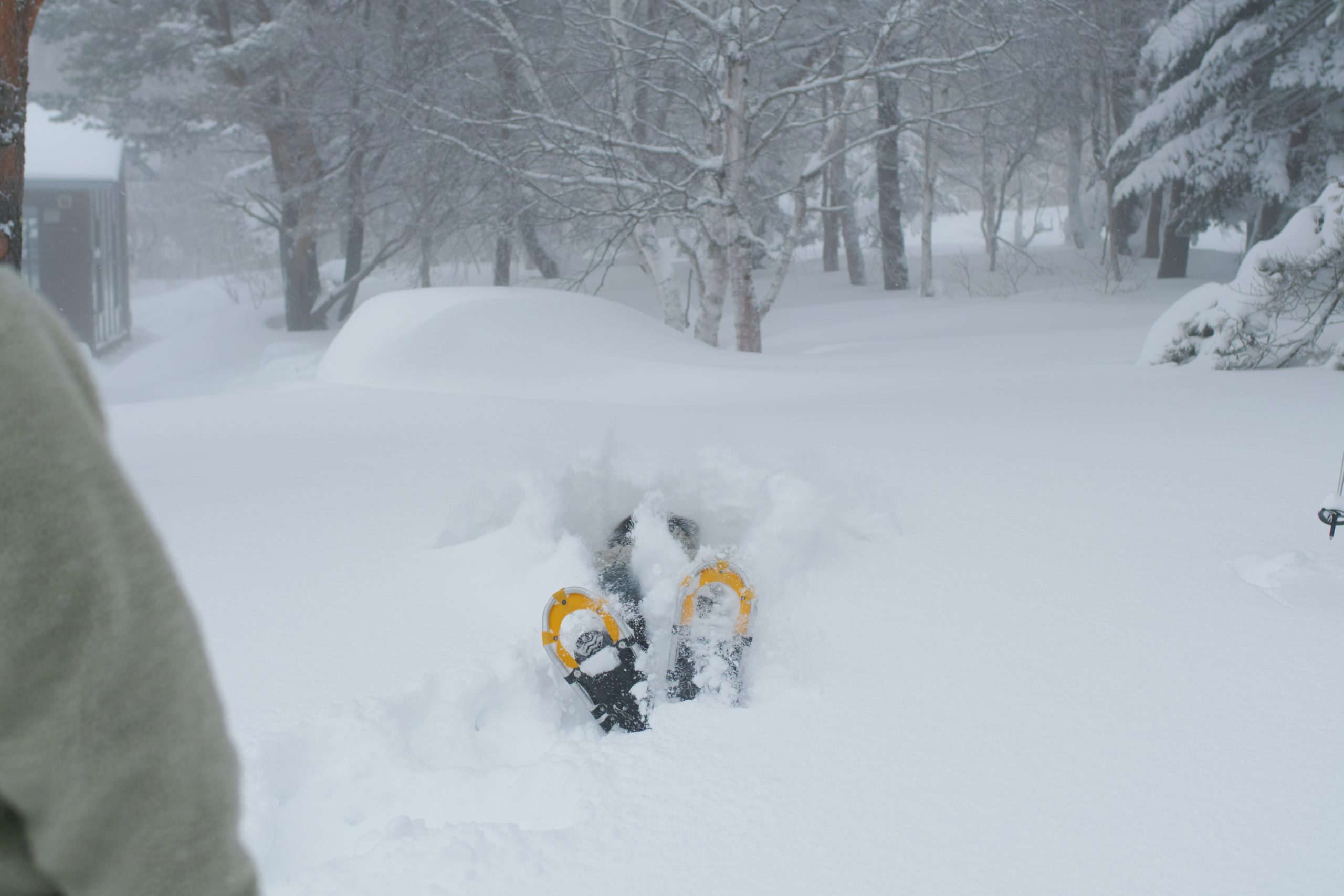 - 新雪に背中から飛び込みます。勇気をもってやってみると、気持ちがいい!