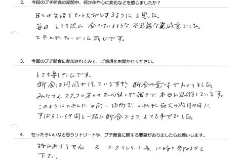 ・2日目が排毒により体調を崩しやすい日なのですが、今回はあまりひどく体調を崩すこともなく、2.3時間寝たら回復したという方がいらっしゃいました。