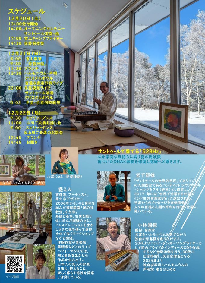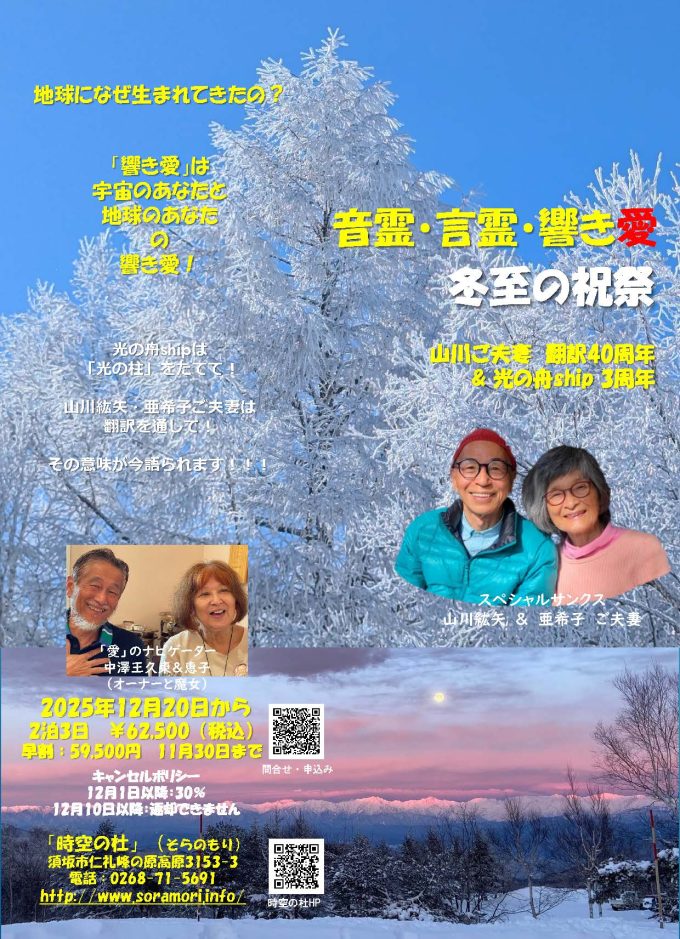 長野リトリート 「2025年 冬至の祝祭 」 12月20日12月21日12月22日 祝祭 2025年 冬至 (12月22日0時3分)の祝祭 in 時空の杜 音霊・言霊・響き愛 山川紘矢&亜希子ご夫妻 翻訳40周年 光の舟shiip 3周年 12月20日(土)より22日(月)の2泊3日は冬至の祝祭です! 体験参加情報一覧