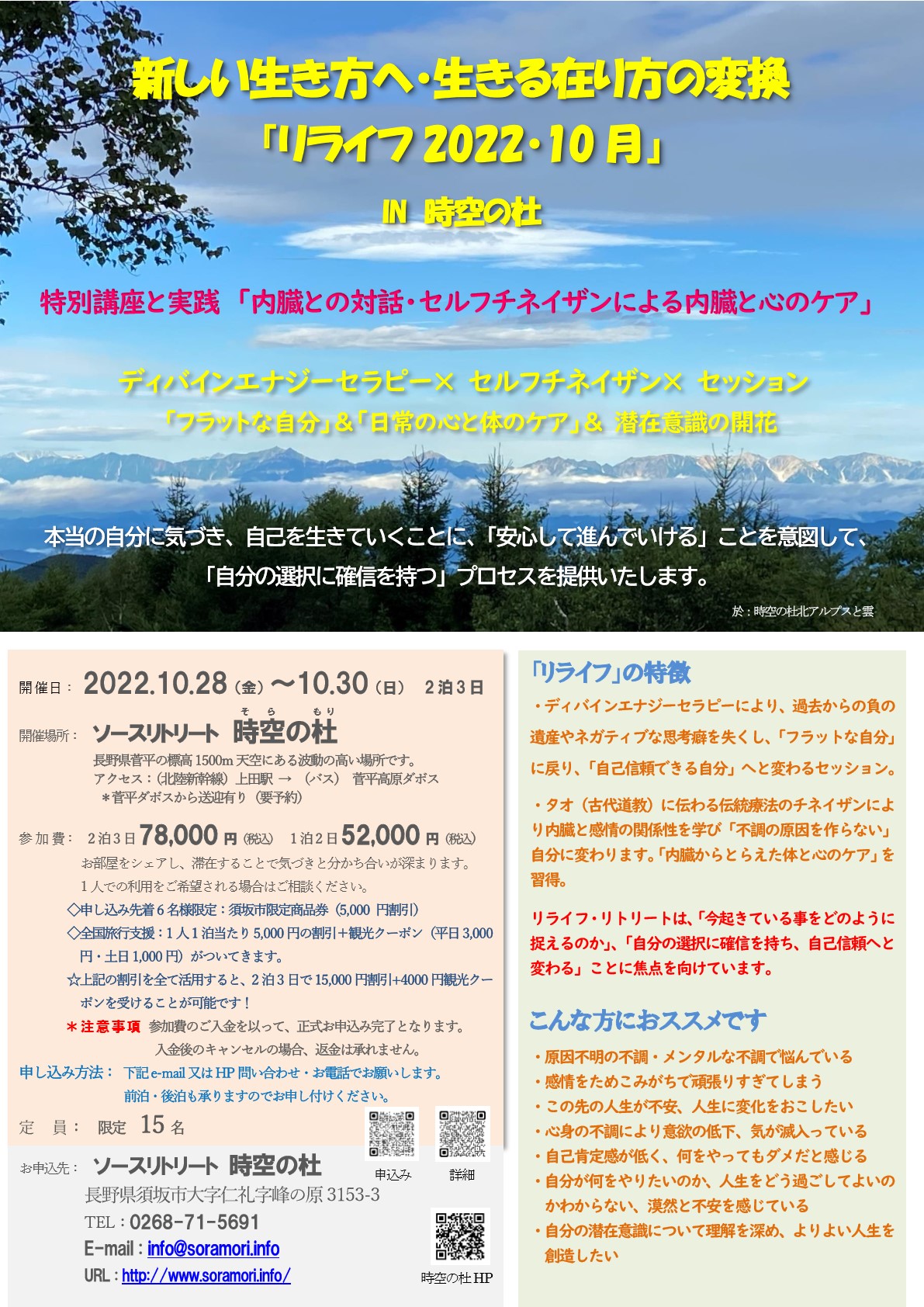 なお、突然都合つかなくなった場合、別のリトリートに振り替えることも出来ますのでご相談ください。