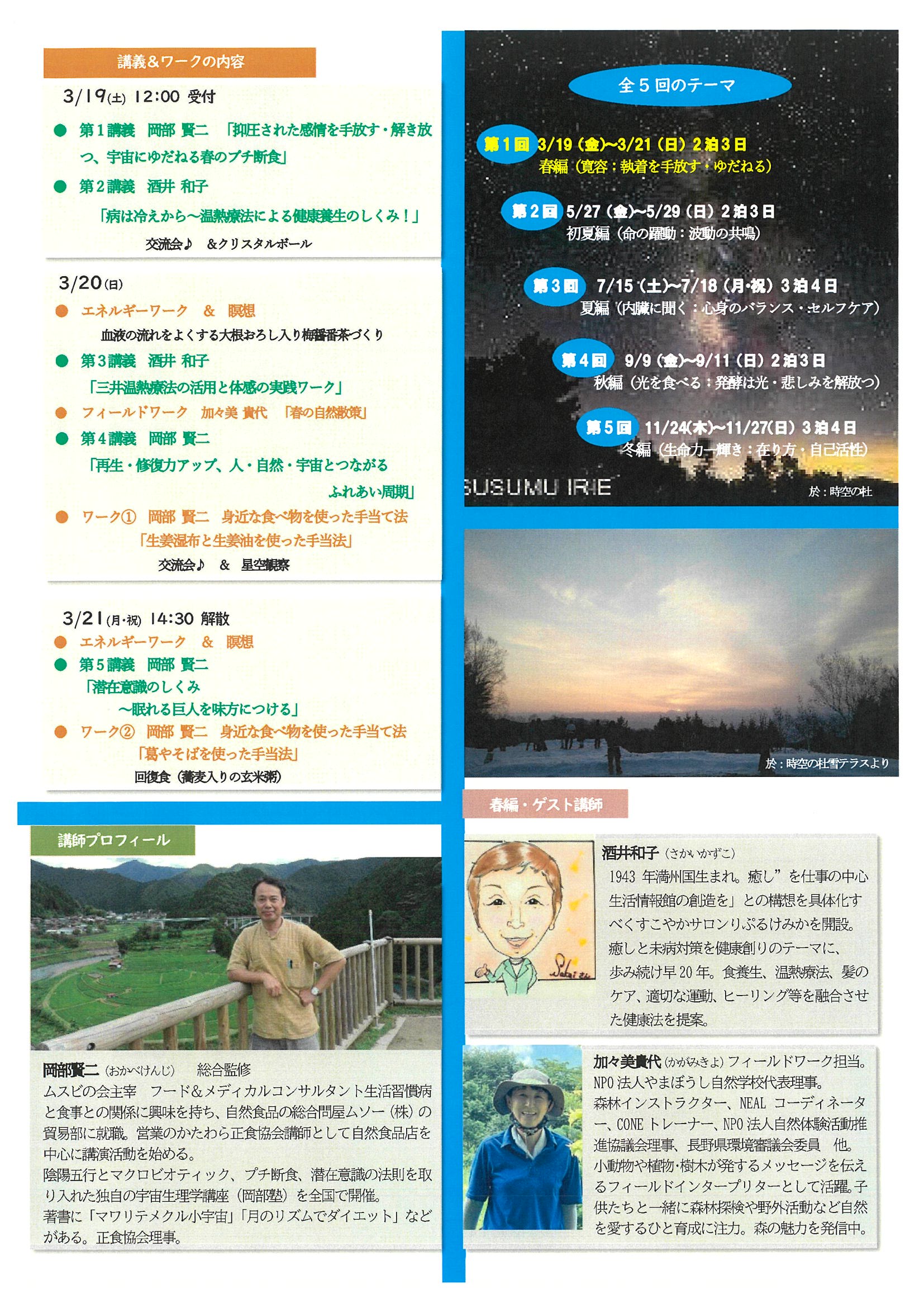 毎回、マクロビオティックのムスビの会主宰 岡部賢二先生と多才なゲスト講師による「楽しくてお腹がすかない」プチ断食講座です。