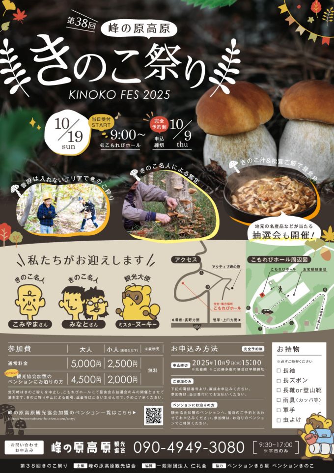 きのこ祭り 2025年10月19日 体験会 きのこ祭り 温かいスープと美味しい食事 きのこ祭りの前日は 時空の杜でお過ごしください。 年1回の「きのこ祭り」に参加いかがですか! 峰の原高原で10月19日(日)9時からスタート 時空の杜では前日の18日の宿泊を受け付けています。 宿泊施設を決めてからきのこ祭り参加申し込みとなります。 きのこ祭り参加費 大人4500円(税込) 子供2000円(税込) 宿泊ご希望の方は、こちらから 時空の杜プラン一覧 お気軽にお問合せ下さい ありがとうございます。 体験参加情報一覧