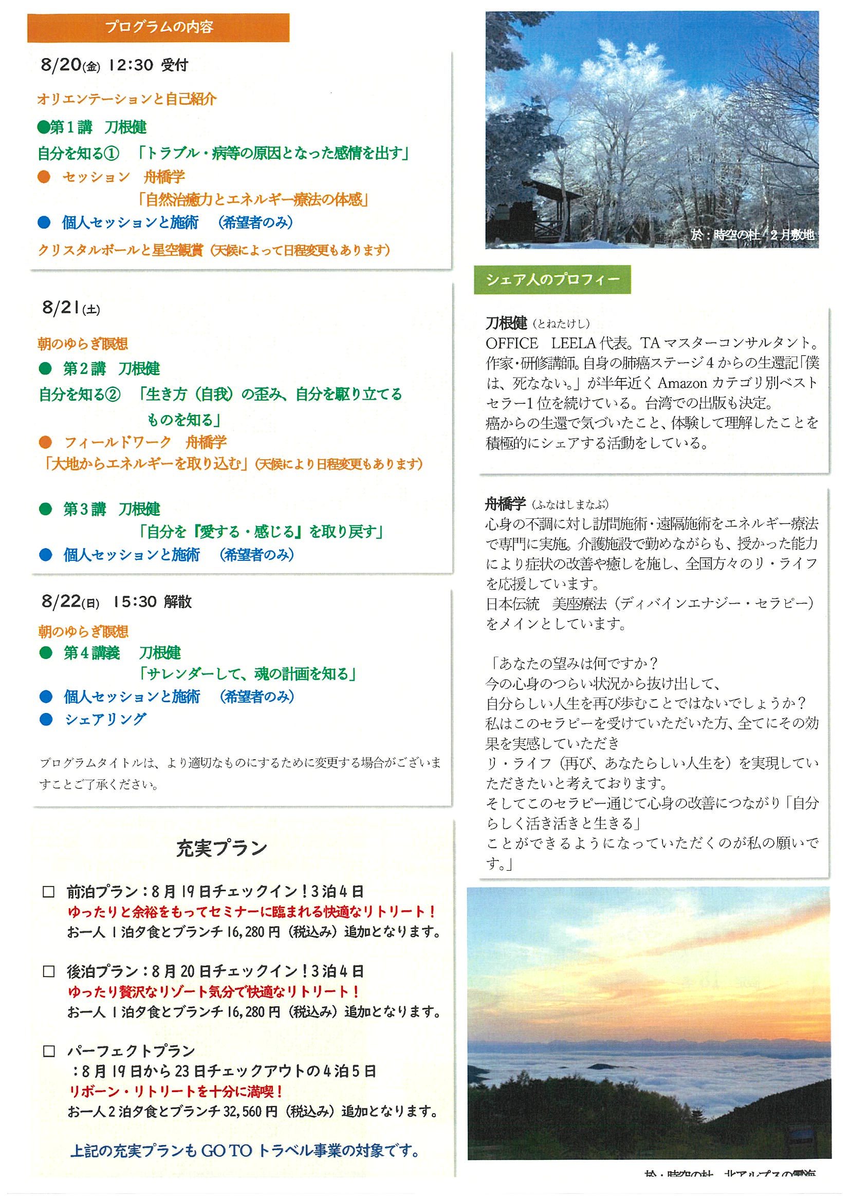このリトリートは「心理的なワーク」「エネルギー施術」の2方面で行うことが大きな特徴です。