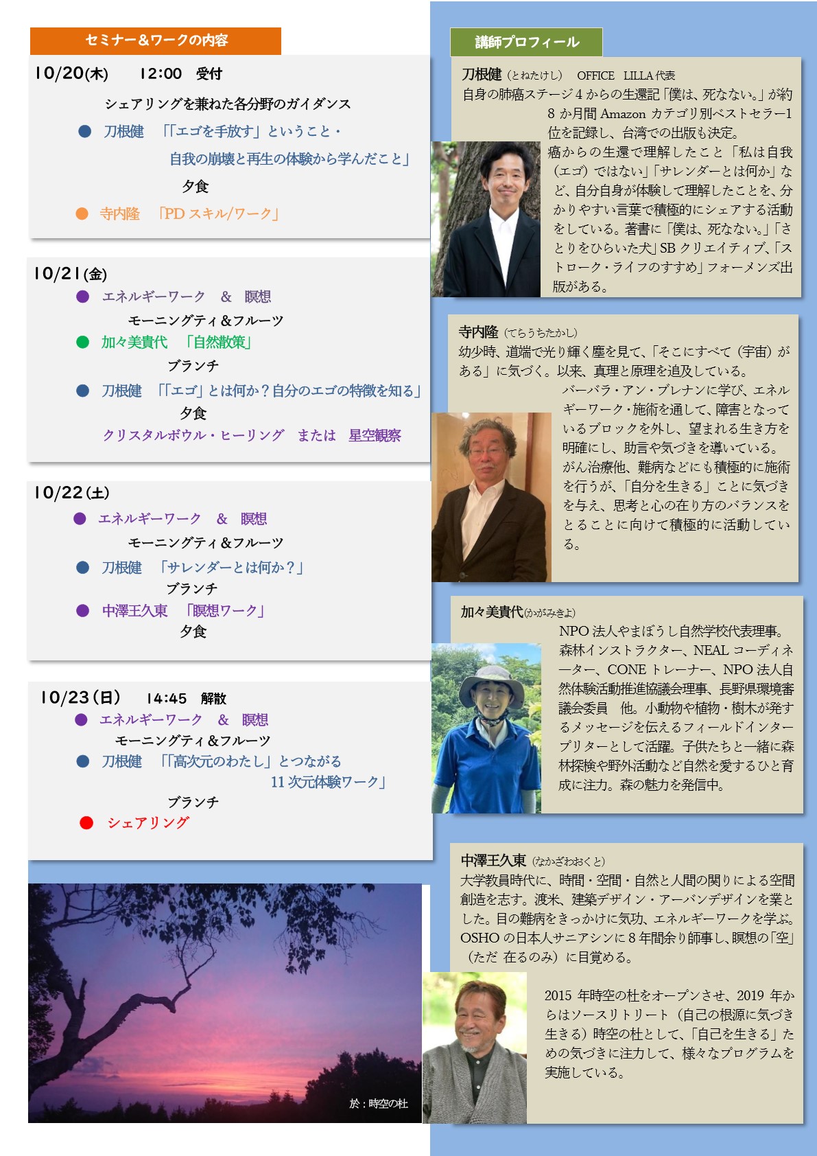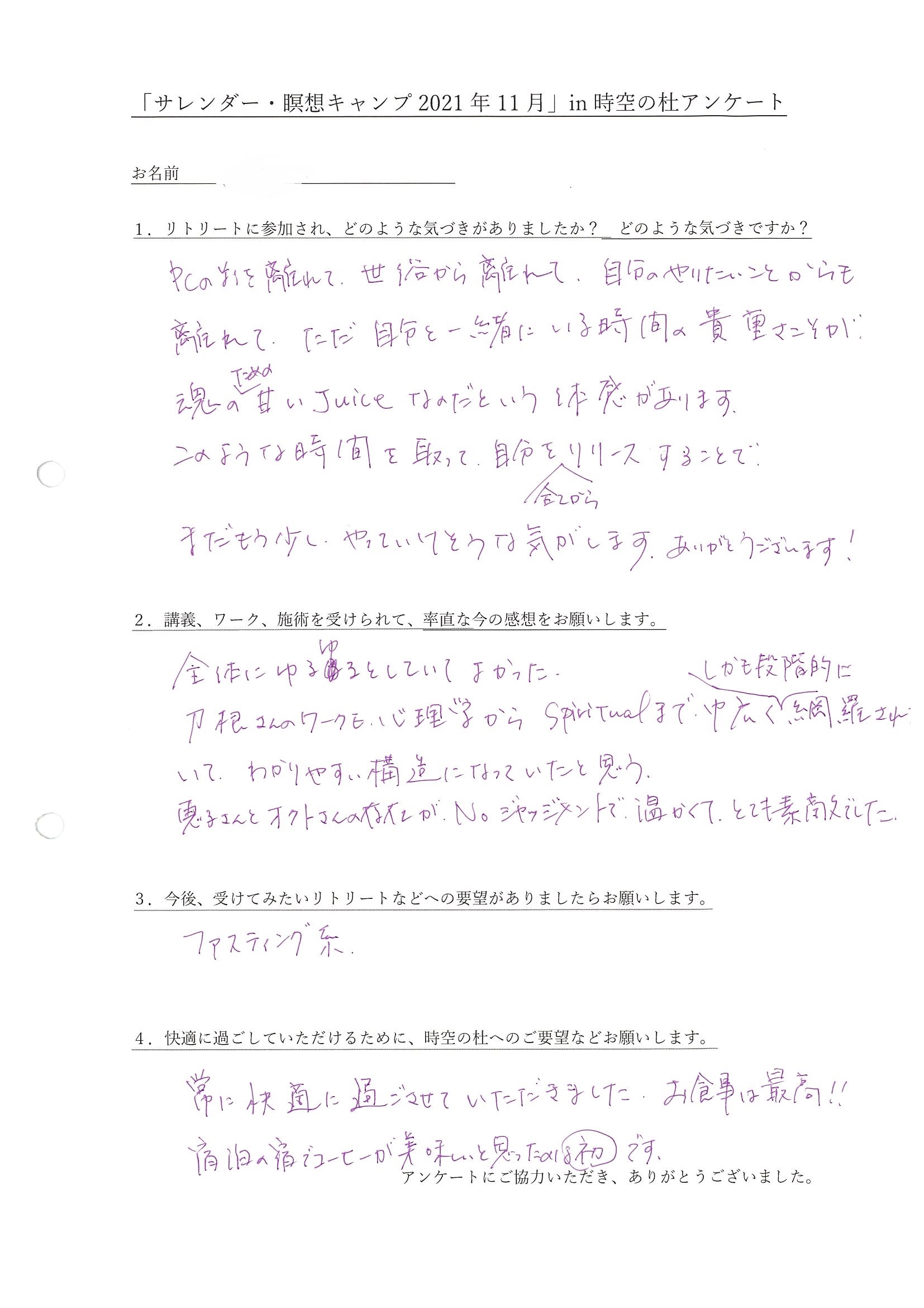・PCの前を離れて、世俗から離れて、自分のやりたいことからも離れて、ただ自分と一緒にいる時間の貴重さこそが魂のための甘いJuiceなのだという体感があります。このような時間を取って、自分を全てからリリースすることで、まだもう少し、やっていけそうな気がします、ありがとうございます!全体にゆるゆるとしていてよかったし、刀根さんのワークも心理学からSpiritualまで幅広くしかも段階的に網羅されていて、わかりやすい構造になっていたと思う。(東京都 T・Aさん)