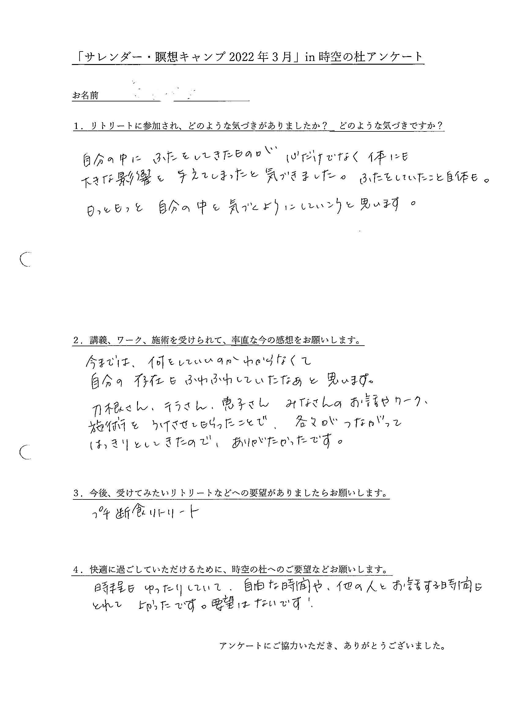 ・自分のなかにふたをしてきたものが、心だけでなく身体にも大きな影響を与えてしまったと気づきました。ふたをしていたこと自体も。もっともっと自分の中を気づくようにしていこうと思います。今までは何をしていいのかわからなくて、自分の存在もふわふわしていたなあと思います。みなさんのお話やワーク、施術をうけさせてもらったことで、各々がつながってはっきりとしてきたのでありがたかったです。(埼玉県 M.Mさん)