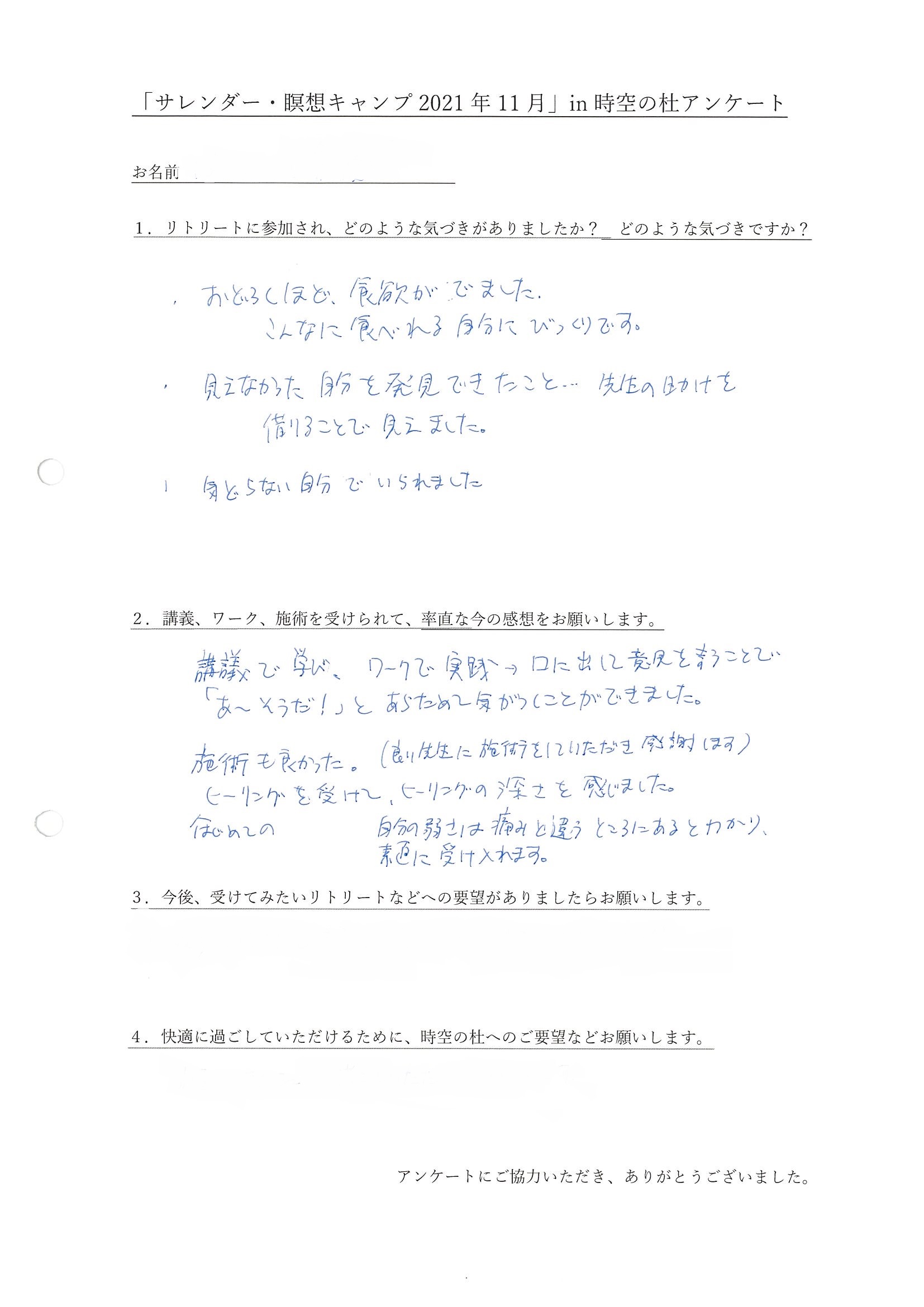 ・おどろくほど食欲がでました、こんなに食べられる自分にびっくりです。見えなかった自分を発見できたこと、、、先生の助けを借りることで見えました。気どらない自分でいられました。講義で学び、ワークで実践→口に出して意見を言うことで「あ~そうだ!」とあらためて気がつくことができました。施術も良かった。はじめてのヒーリングを受けて、ヒーリングの深さを感じました。自分の弱さは痛みと違うところにあるとわかり、素直に受け入れます。(東京都 Y・Hさん)