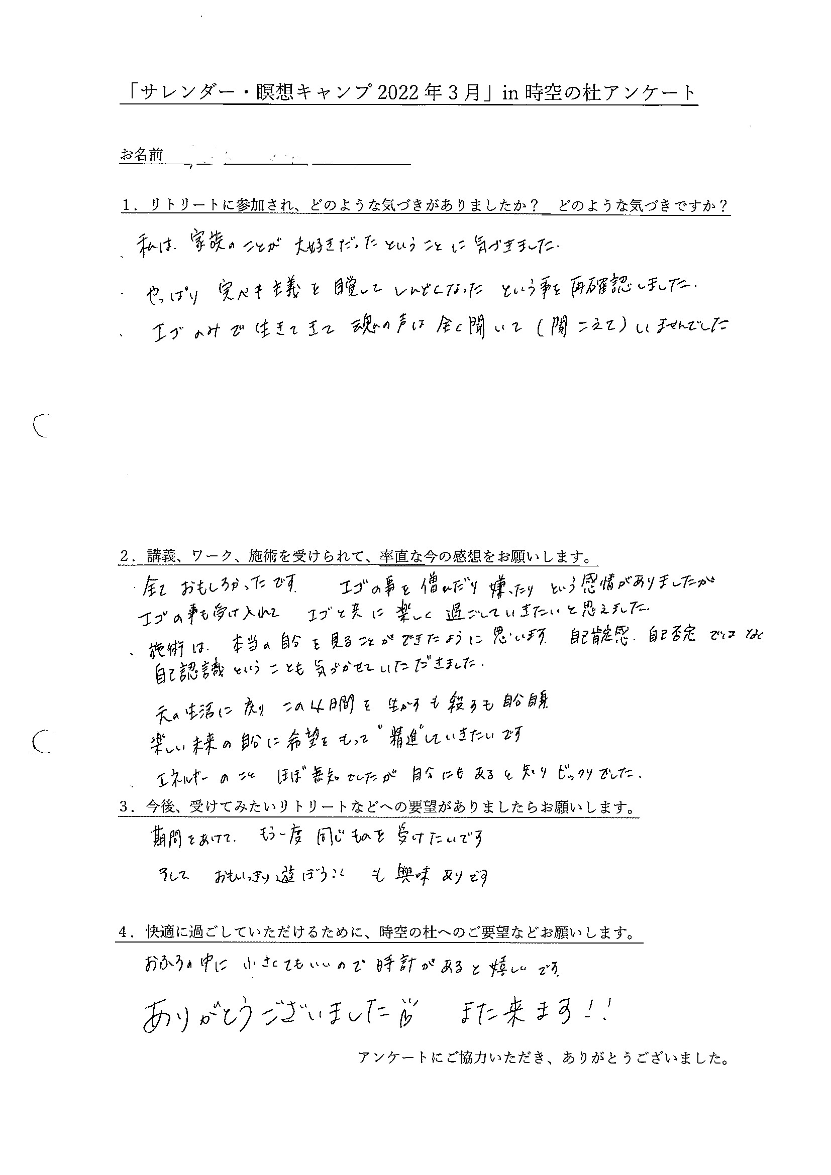 ・私は家族のことが大好きだったということに気づきました。やっぱり完璧主義を目指してしんどくなったということを再確認しました。エゴのみで生きてきて、魂の声は全く聞いて(聞こえて)いませんでした。エゴのことを憎んだり嫌ったりという感情がありましたが、エゴのことも受け入れて、エゴと共に楽しく過ごしていきたいと思えました。施術は、本当の自分を見ることが出来たように思います。自己肯定感、自己否定ではなく、自己認識ということも気づかせていただきました。元の生活に戻り、この4日間を活かすも殺すも自分自身、楽しい未来の自分に希望を持って“精進”していきたいです。(大阪府 S.Oさん)