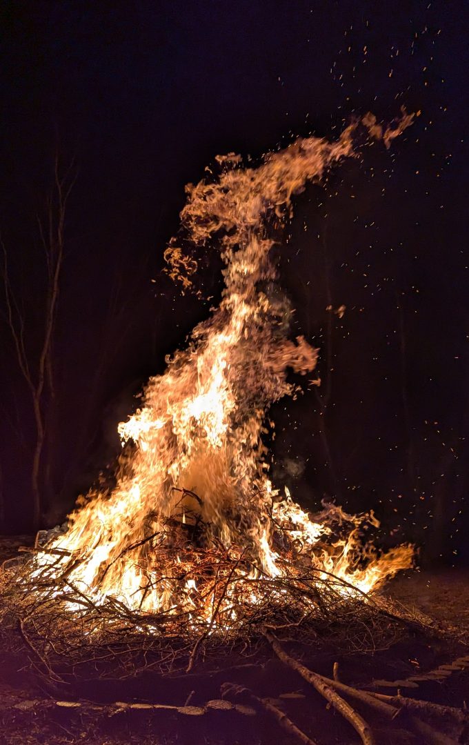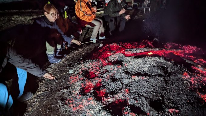 「山のような木を燃やし・火を囲んで」